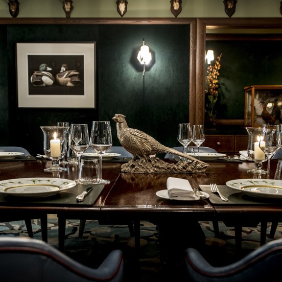 Chef's Table: A truly unique private dining room in Mayfair is the Chef's Table, which can accommodate up to 14 guests. Perfect for an anniversary gift or an intimate birthday celebration, guests at the Chef's Table can witness the restaurant’s expert team at work through a large glass window that opens up into the kitchen. This forest green room is inspired by the colours of the mallard duck trimmed with antlers, with an oval antique table set with hand-decorated fine china. True elegance.